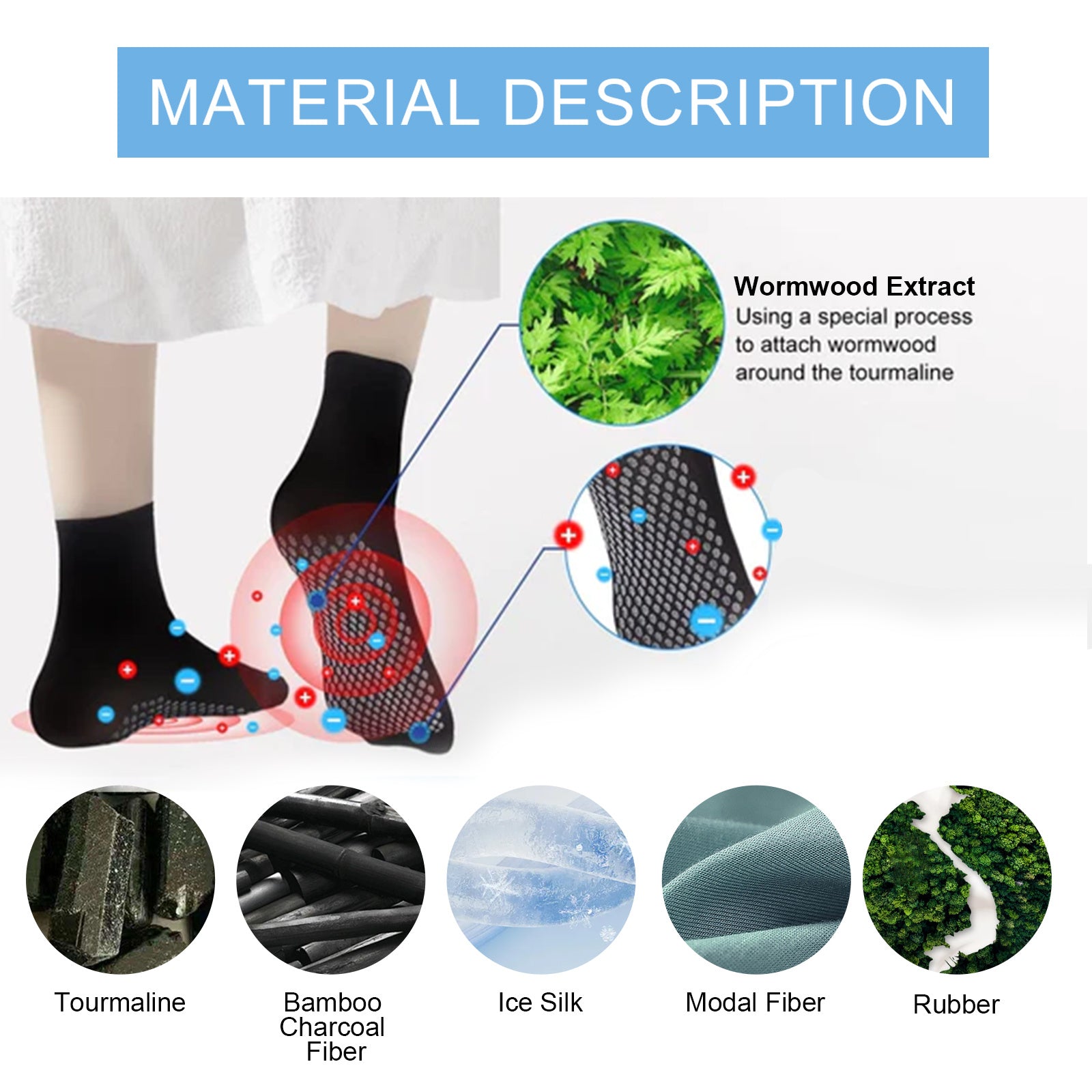 Our stretch socks contain mugwort extract, rubber, and tourmaline. It can eliminate waste and excess fat in the body, accelerate metabolism, solve lymphatic problems, and significantly improve blood circulation throughout the body. Prevent cancer cells, enhance the immune system, reduce physical fatigue and chronic inflammation, permanently eliminate varicose veins and spider veins, and quickly relieve swelling and heaviness in the legs, ankles, and feet. Its usage is simple: clean and dry your feet, put on socks, and then engage in daily activities as usual. Massage stimulates the muscles of the feet and calves, promotes blood circulation, relaxes the feet, relieves symptoms such as varicose veins, muscle tension, and foot fatigue.